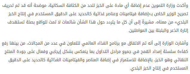 كل اللي الوزارة قالته بخصوص الموضوع ده هو انه “هيتم إضافة فيتامينات وعناصر غذائية كالحديد على الدقيق المستخدم في إنتاج الخبز البلدي” و دي حاجة مش أول مرة تحصل.