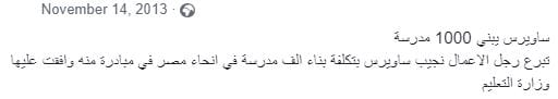 تبرع رجل الاعمال نجيب ساويرس بتكلفة بناء الف مدرسة في انحاء مصر في مبادرة منه وافقت عليها وزارة التعليم لمصر