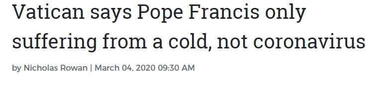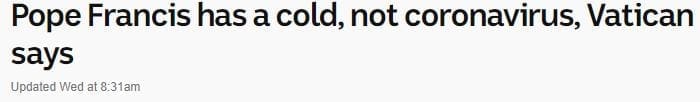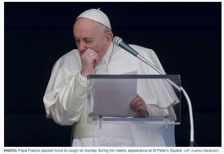 الفاتيكان اعلنوا في بيان يوم الأربعاء 4 مارس ، قال فيه المتحدث باسم الفاتيكان ماتيو بروني إن نزلة برد البابا فرانسيس “تسير في مسارها ، دون أعراض مرتبطة بأمراض أخرى”.